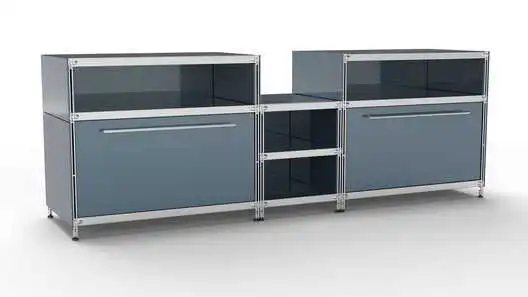Metall-KUBUS in Höhe und Breite beliebig mit Klappen, Doppelschublade, großem Schubfach oder offenen Elementen lieferbar. In weiteren Farbvarianten erhältlich: weiß, schwarz oder Sonderfarben.