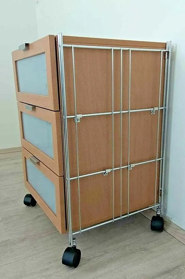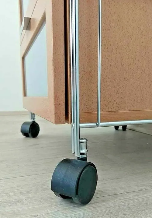 Der Holzkorpi wird in verchromte Regalleitern aus der BIII 380 Serie mit 38 cm Tiefe montiert. Mit den beigefügten Möbelrollen ist der Korbi mobil. Alternativ kann der der Container aber auch zur Kommode oder Standbord umgestaltet werde