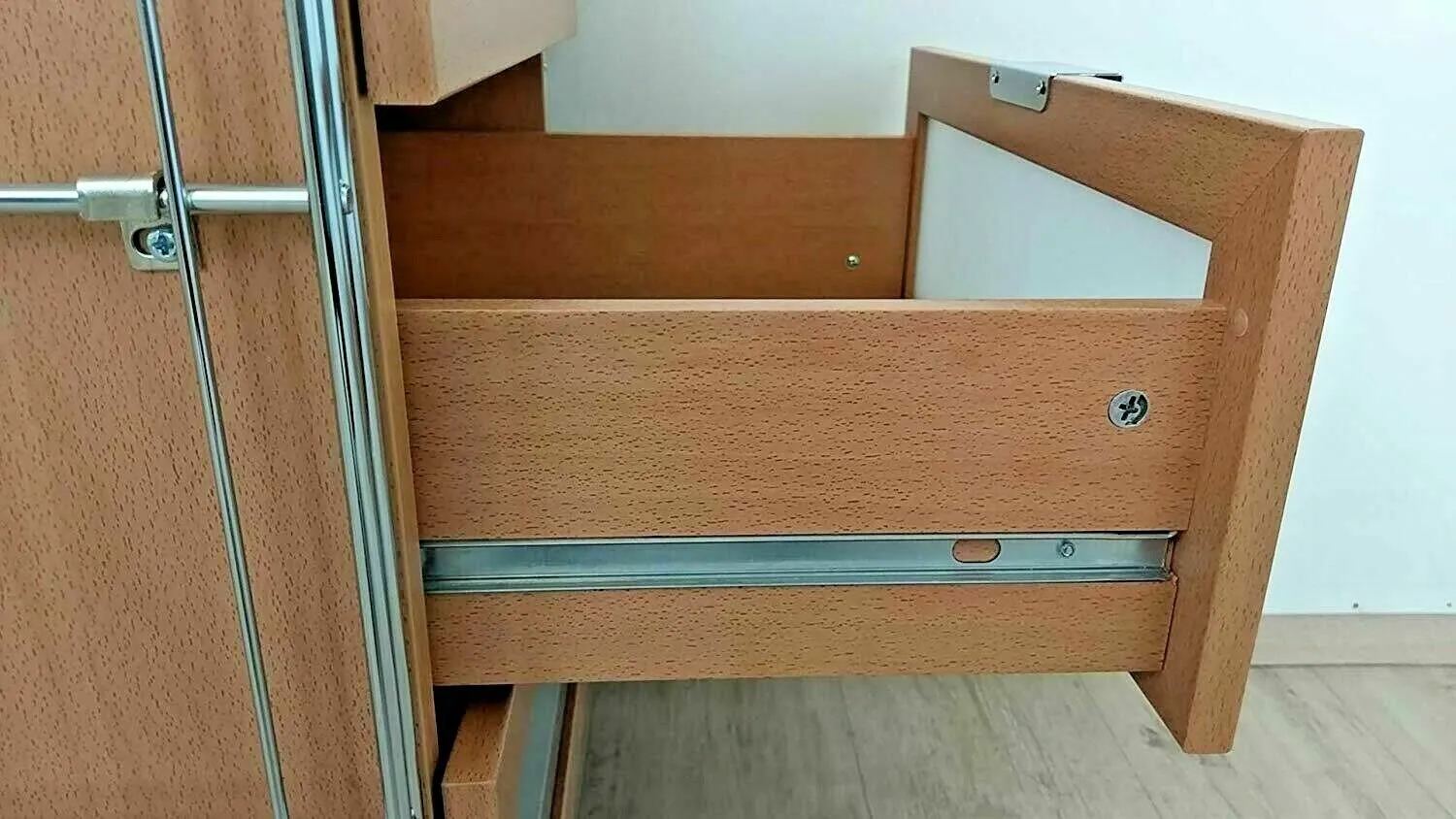 Die Glasscheibe ist aus 4 mm Sicherheitsglas. Die Kästen laufen auf robusten Metallschienen. Praktische Metallgriffe erleichtern das Öffnen und Schließen der Schubkästen.