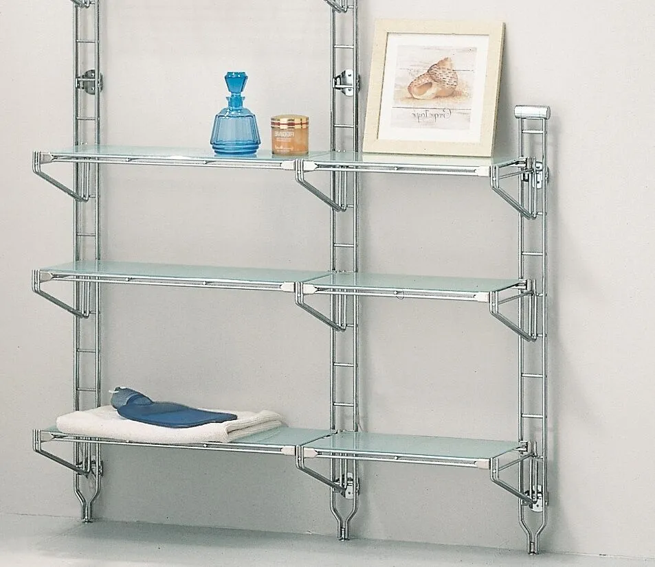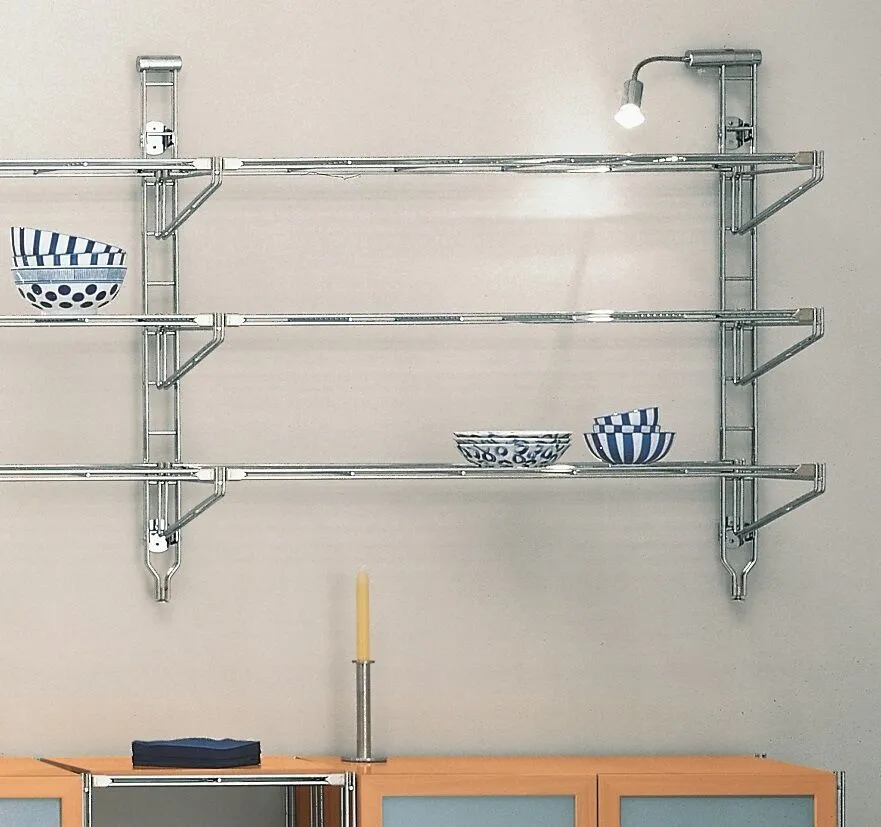 Hochwertig verarbeitete Wandleiter für freitragende Regale der Serie BIII 380, BIII 250 und BIII MICRO, aus Stahl, verchromt. Die Leiter ist 6 cm breit. Ein Raster beträgt ca. 9,2 cm. Benötigte Halterungen und Schrauben sind beigefügt. Für ein Regal werden 2 Wandleitern, sowie die entsprechende Anzahl an Böden und Bodenträgern benötigt.