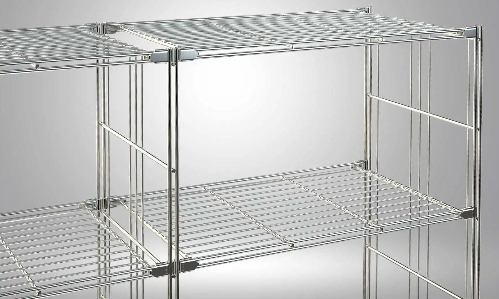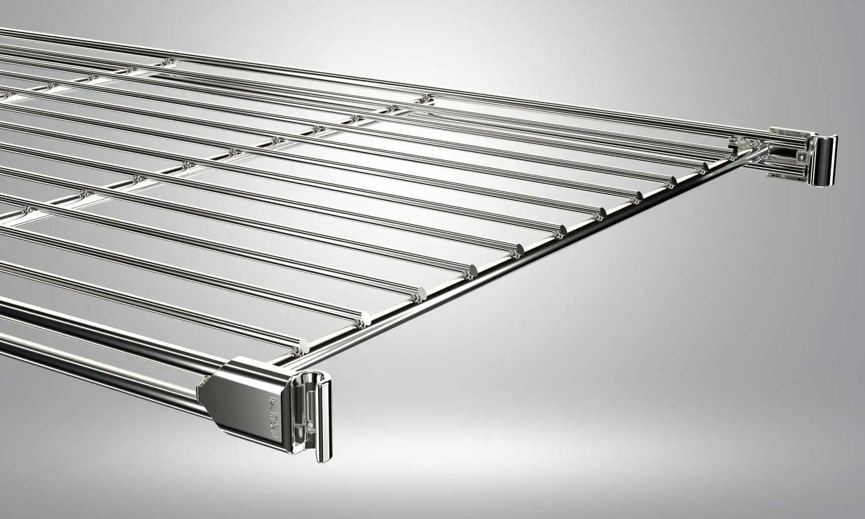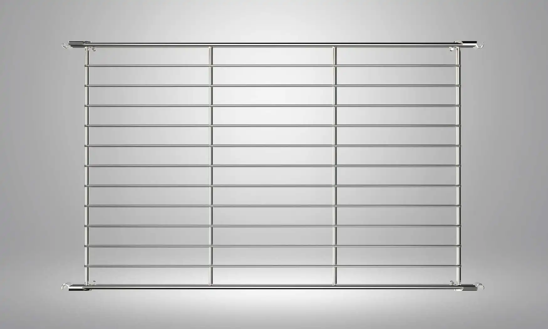 Hochwertig verarbeiteter Gitterboden aus verchromtem Stahl mit 4 Beschlägen zum Befestigen des Regalleiter Diese liegen dem Boden bei.
