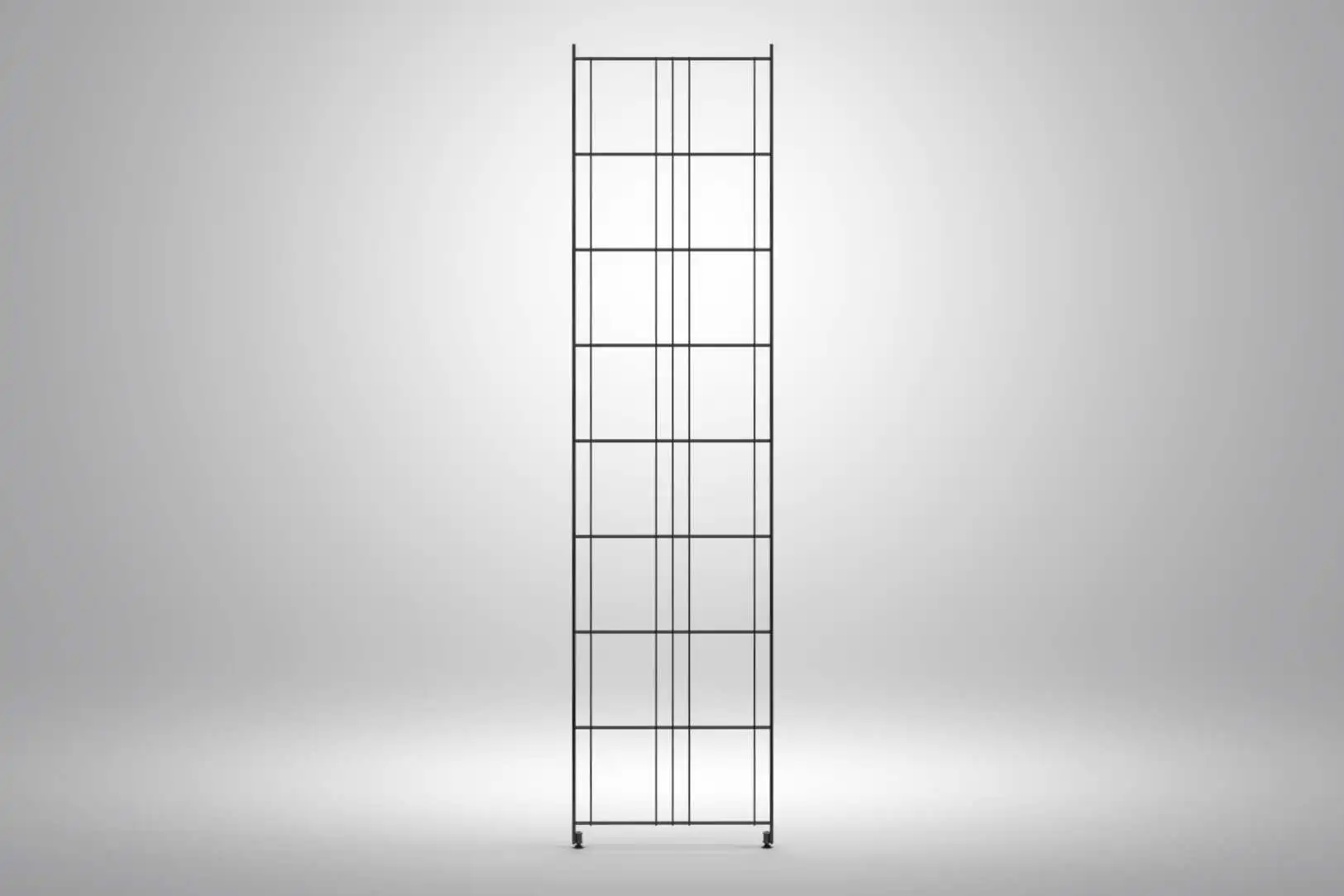 Die Gitterböden lassen sich an jeder Querstrebe einhängen. Mit Ergänzungssets ist das Regal in der Breite beliebig erweiterbar.