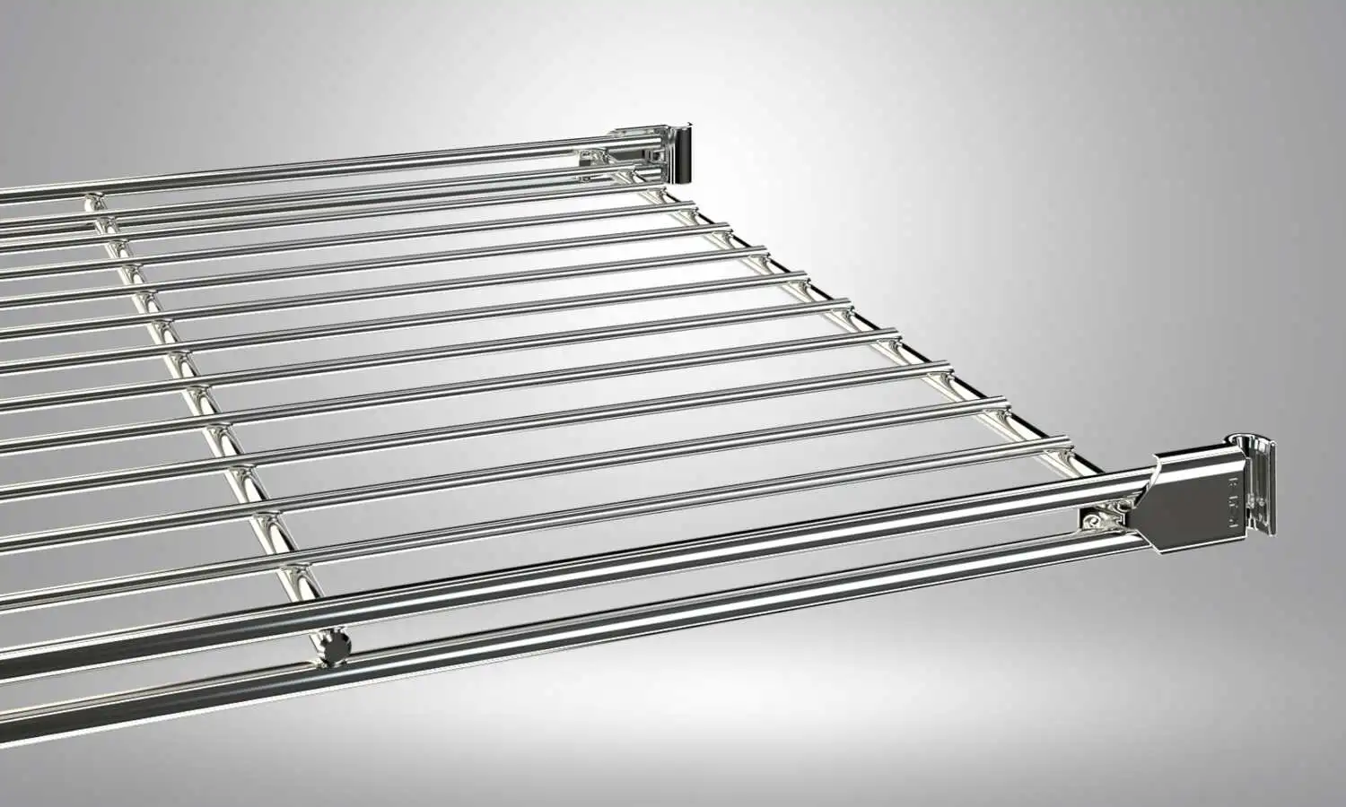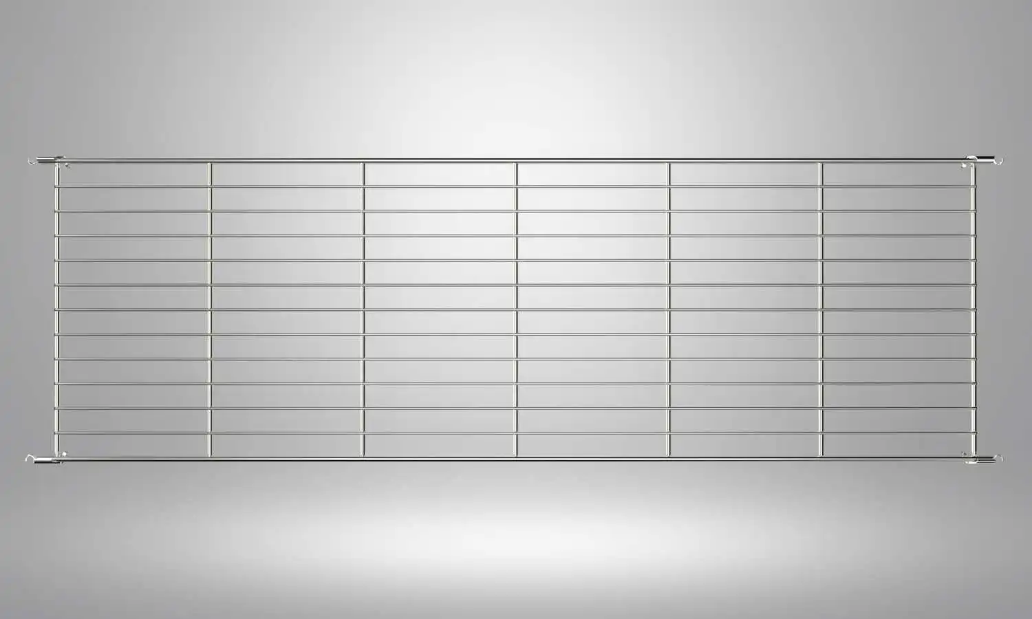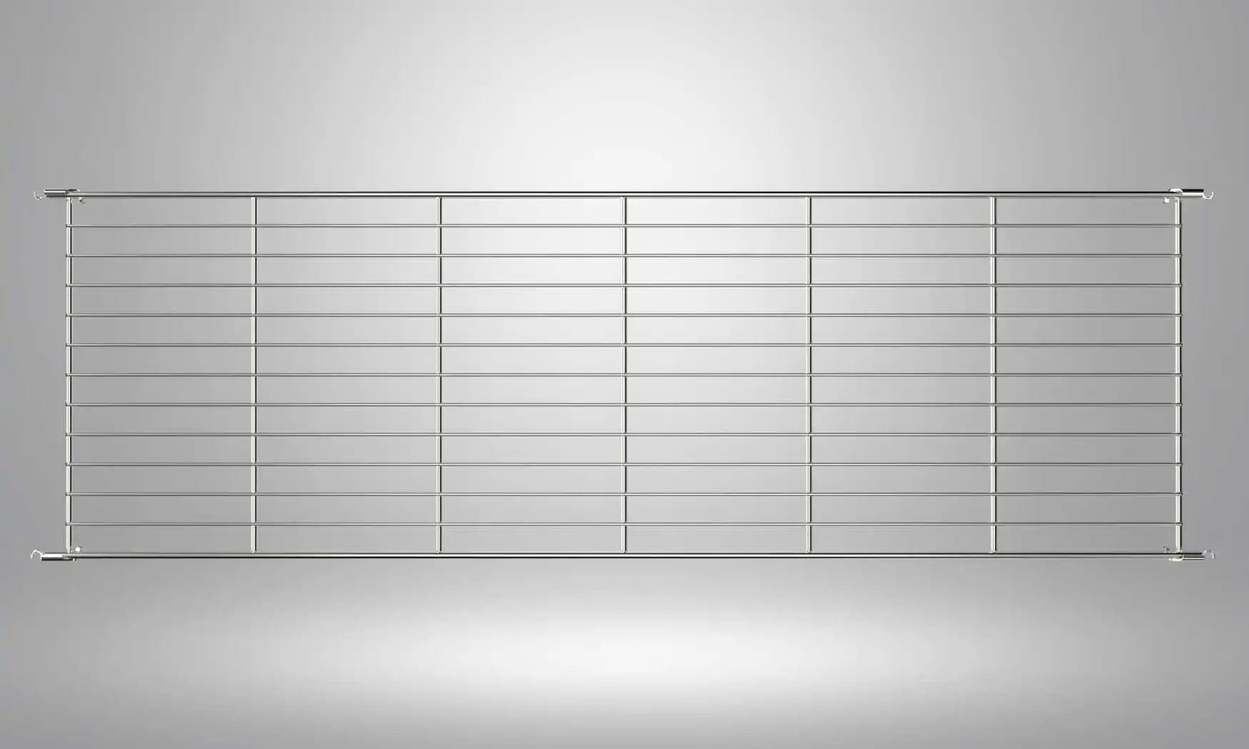 Hochwertig verarbeiteter Gitterboden aus verchromtem Stahl mit 4 Beschlägen zum Befestigen des Regalleiter Diese liegen dem Boden bei. Die Innenmaße des Gitterbodens ohne Beschläge beträgt ca. 118,25 x 38,3 cm mm.