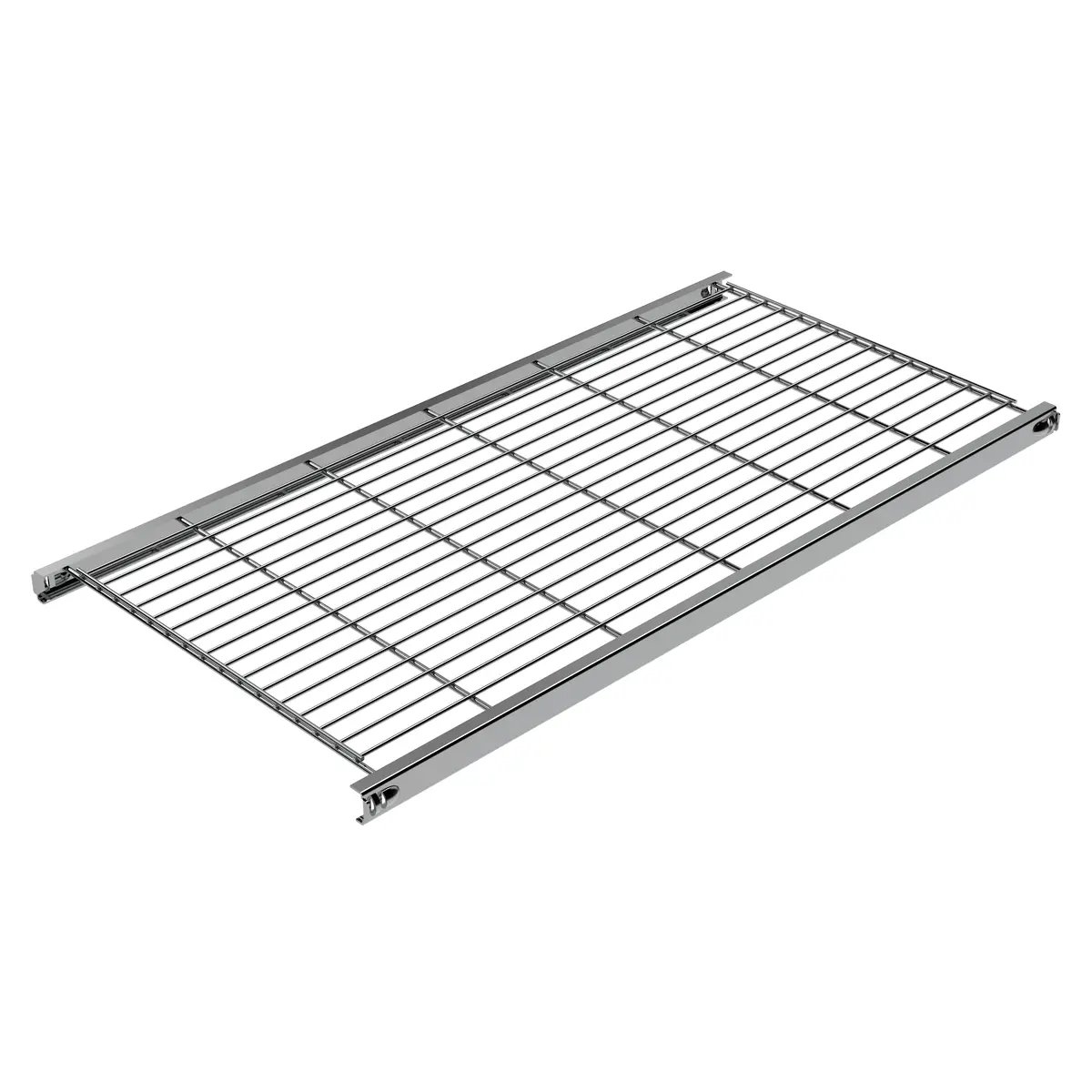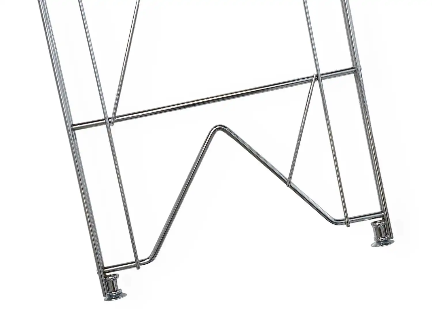 Klassisches Designer-Regal in kühlem verchromtem Metall. Das Regal ist äußerst stabil und passt zu jedem Wohn-, Geschäfts- und Bürostil. Die Böden verfügen über integrierten Halterungen. Dadurch ist die Montage einfach und schnell ohne Spezial-Werkzeuge möglich. Die Gitterböden lassen sich individuell an jeder Querstrebe anordnen.