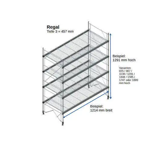 Bestehend aus 2 x Regalleitern, 835 - 987 - 1139 - 1291 - 1444 - 1595 - 1747 - oder 1899 mm hoch, mit 3 - 6 Gitterborden je nach gewählter Ausführung, 1214 mm breit. Erweiterbar!