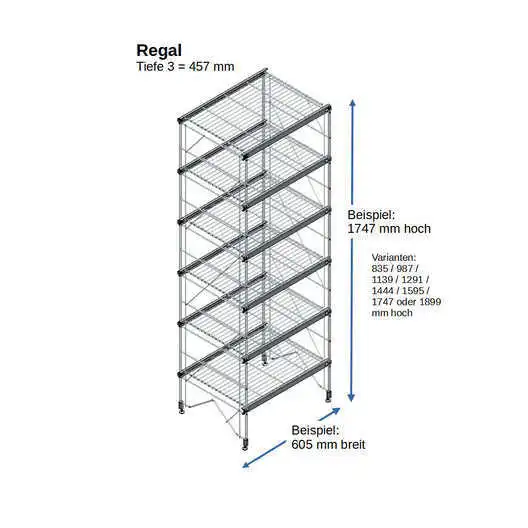 Bestehend aus 2 x Regalleitern, 835 - 987 - 1139 - 1291 - 1444 - 1595 - 1747 - oder 1899 mm hoch, mit 3 - 6 Gitterborden je nach gewählter Ausführung, 605 mm breit. Erweiterbar!