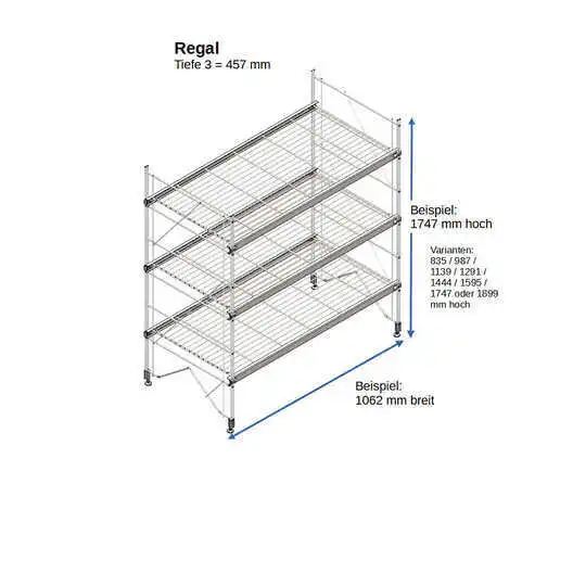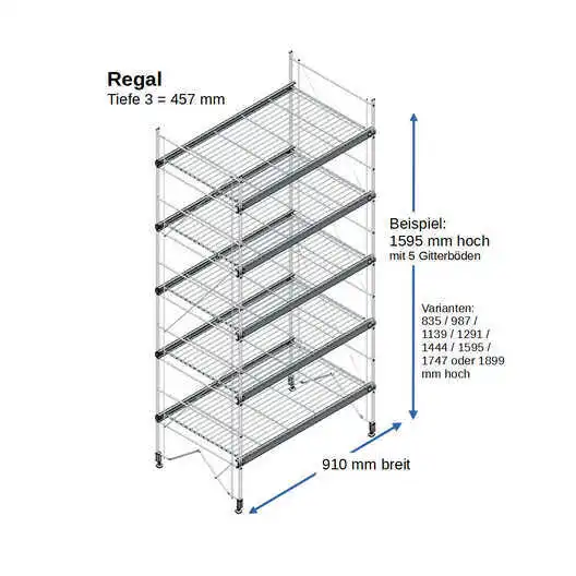 Bestehend aus 2 x Regalleitern, 835 - 987 - 1139 - 1291 - 1444 - 1595 - 1747 - oder 1899 mm hoch, mit 3 - 6 Gitterborden je nach gewählter Ausführung, 457 mm breit. Erweiterbar!