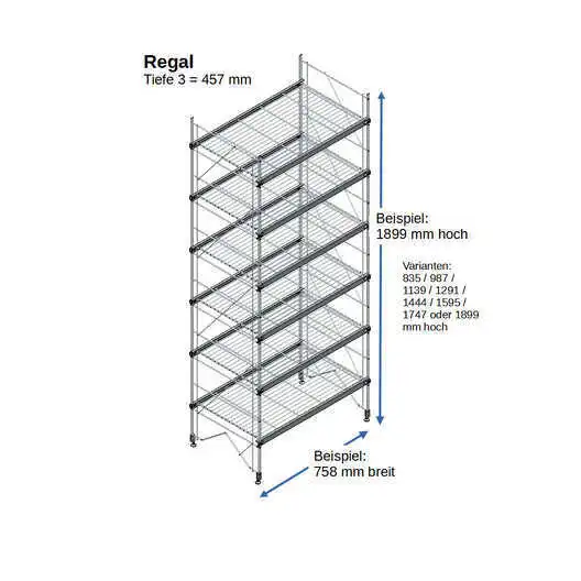 Bestehend aus 2 x Regalleitern, 835 - 987 - 1139 - 1291 - 1444 - 1595 - 1747 - oder 1899 mm hoch, mit 3 - 6 Gitterborden je nach gewählter Ausführung, 758 mm breit. Erweiterbar!
