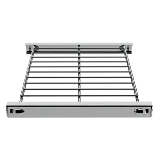 Klassisches Designer-Regal in kühlem verchromtem Metall. Das Regal ist äußerst stabil und passt zu jedem Wohn-, Geschäfts- und Bürostil. Die Böden verfügen über integrierten Halterungen. Dadurch ist die Montage einfach und schnell ohne Spezial-Werkzeuge möglich. Die Gitterböden lassen sich individuell an jeder Querstrebe anordnen.