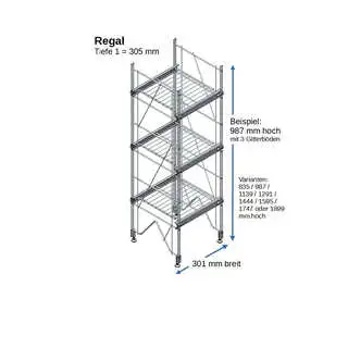 Bestehend aus 2 x Regalleitern, 835 - 987 - 1139 - 1291 - 1444 - 1595 - 1747 - oder 1899 mm hoch, mit 3 - 6 Gitterborden je nach gewählter Ausführung, 301 mm breit. Erweiterbar!