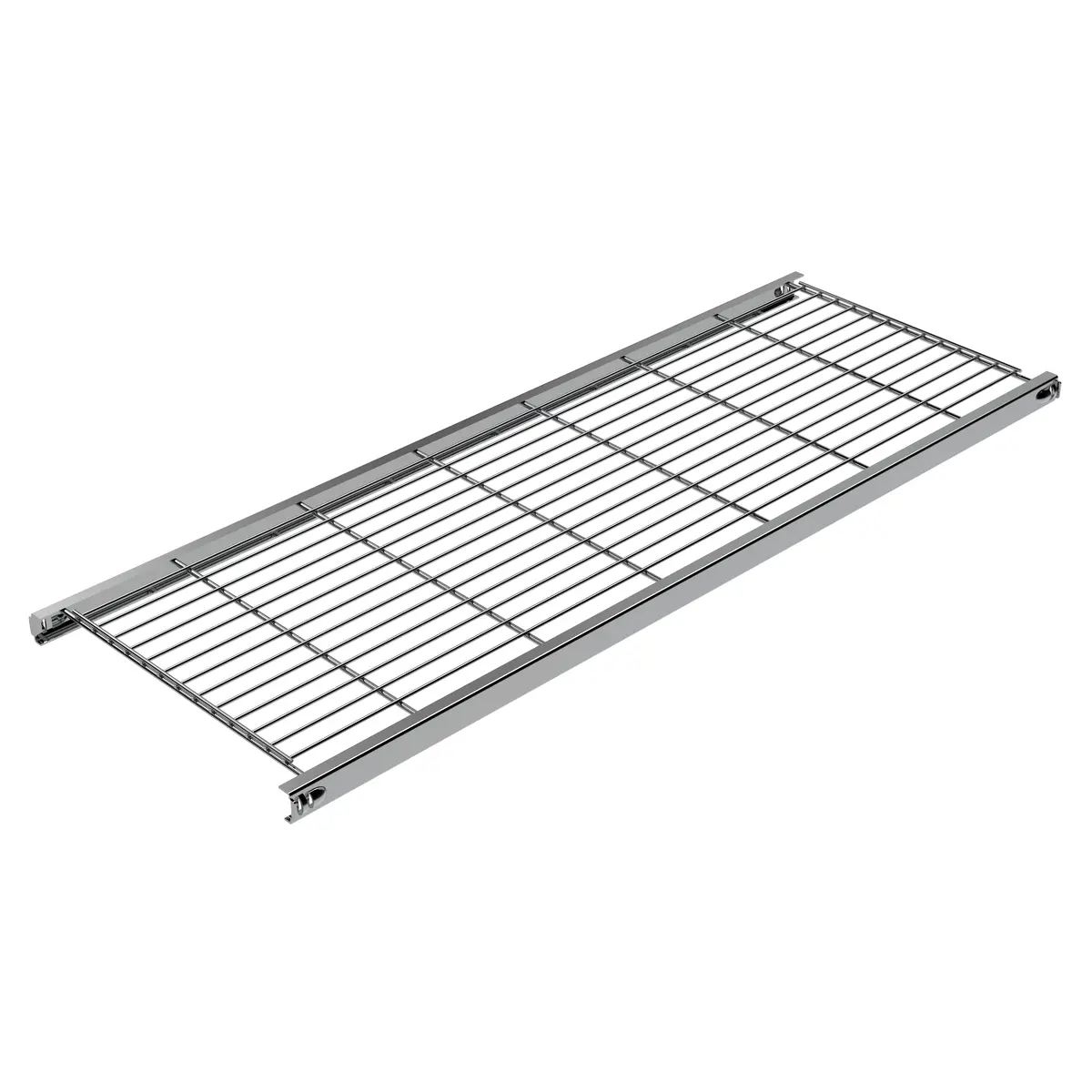 Klassisches Designer-Regal in kühlem verchromtem Metall. Das Regal ist äußerst stabil und passt zu jedem Wohn-, Geschäfts- und Bürostil. Die Böden verfügen über integrierten Halterungen. Dadurch ist die Montage einfach und schnell ohne Spezial-Werkzeuge möglich. Die Gitterböden lassen sich individuell an jeder Querstrebe anordnen.