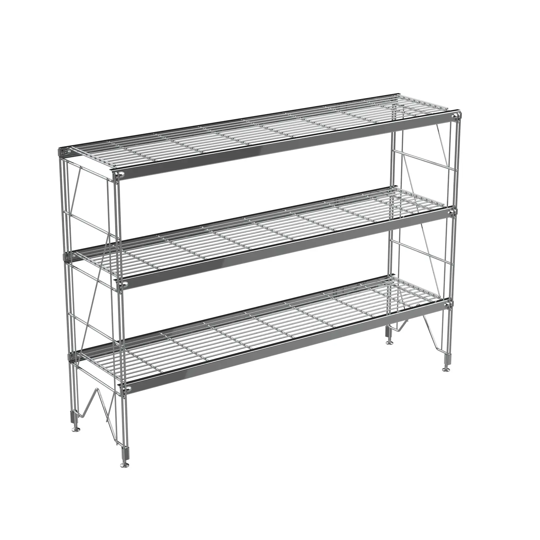Klassisches Designer-Regal in kühlem verchromtem Metall. Das Regal ist äußerst stabil und passt zu jedem Wohn-, Geschäfts- und Bürostil. Die Böden verfügen über integrierten Halterungen. Dadurch ist die Montage einfach und schnell ohne Spezial-Werkzeuge möglich. Die Gitterböden lassen sich individuell an jeder Querstrebe anordnen.