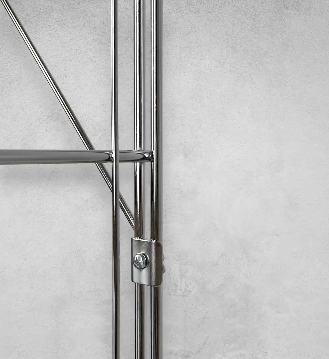 1x Kreuzstrebe Metall, verchromt mit Befestigungsmaterial. Mit dem Stützkreuz steht das Regal stabil und gerade im Raum!