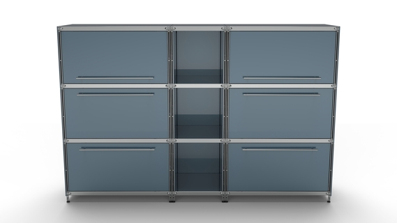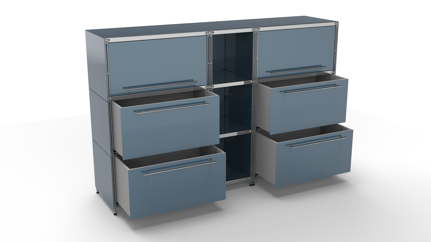 Metall-KUBUS in Höhe und Breite beliebig mit Klappen, Doppelschublade, großem Schubfach oder offenen Elementen lieferbar. In weiteren Farbvarianten erhältlich: weiß, schwarz oder Sonderfarben.
