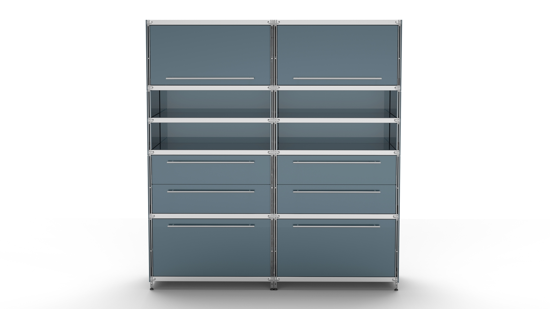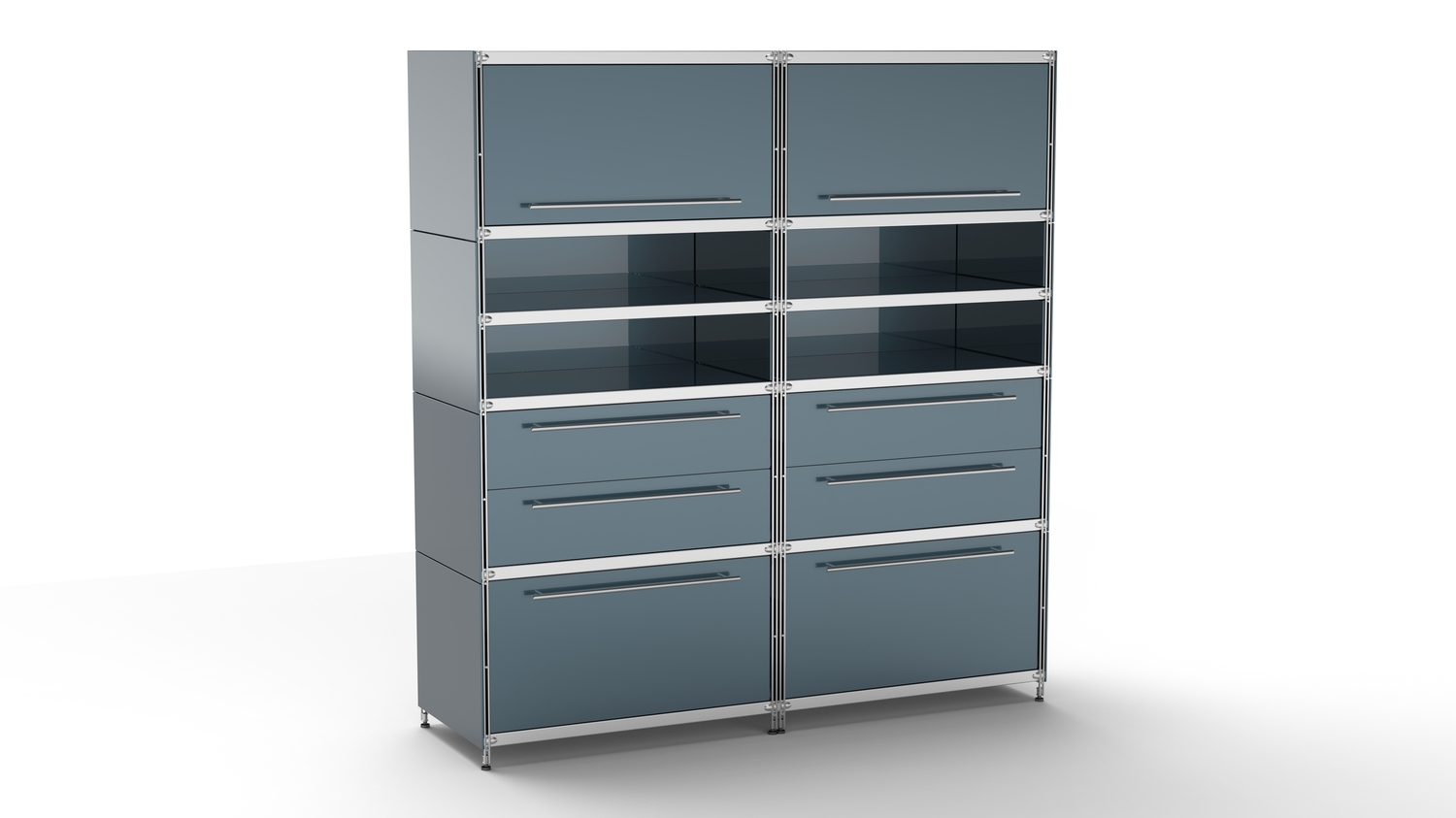 Metall-KUBUS in Höhe und Breite beliebig mit Klappen, Doppelschublade, großem Schubfach oder offenen Elementen lieferbar. In weiteren Farbvarianten erhältlich: weiß, schwarz oder Sonderfarben.