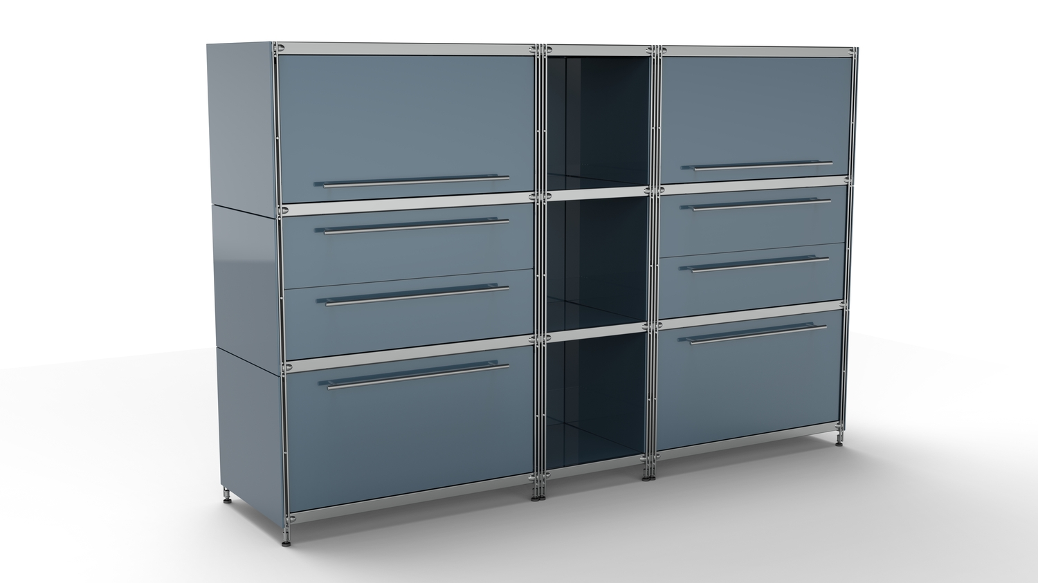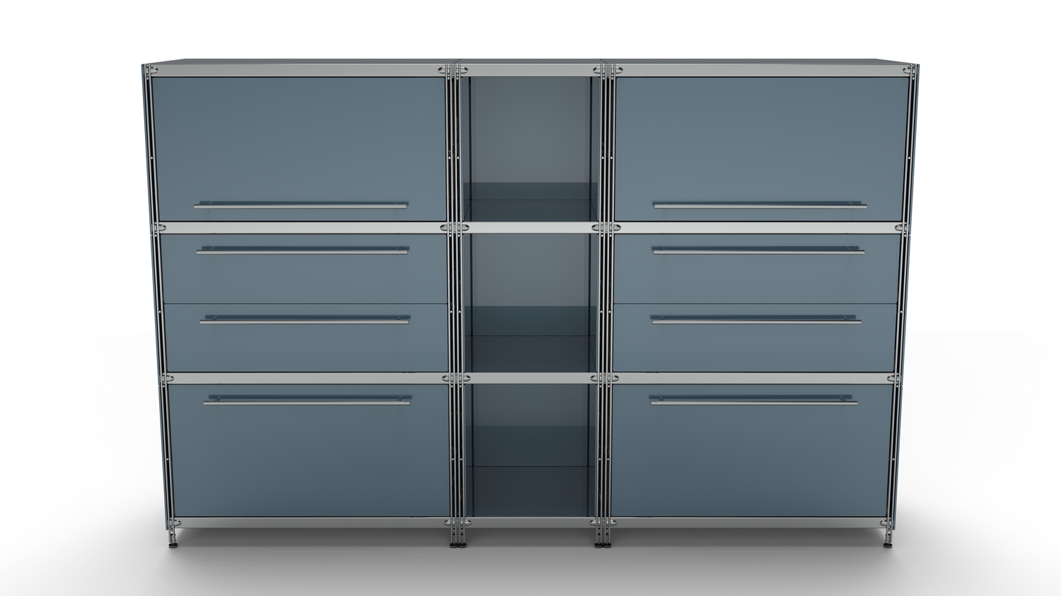 Metall-KUBUS in Höhe und Breite beliebig mit Klappen, Doppelschublade, großem Schubfach oder offenen Elementen lieferbar. In weiteren Farbvarianten erhältlich: weiß, schwarz oder Sonderfarben.