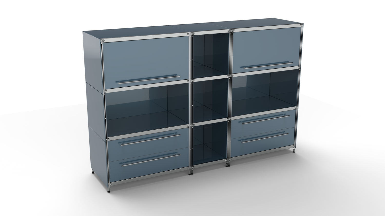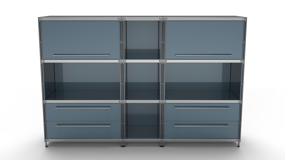 Metall-KUBUS in Höhe und Breite beliebig mit Klappen, Doppelschublade, großem Schubfach oder offenen Elementen lieferbar. In weiteren Farbvarianten erhältlich: weiß, schwarz oder Sonderfarben.