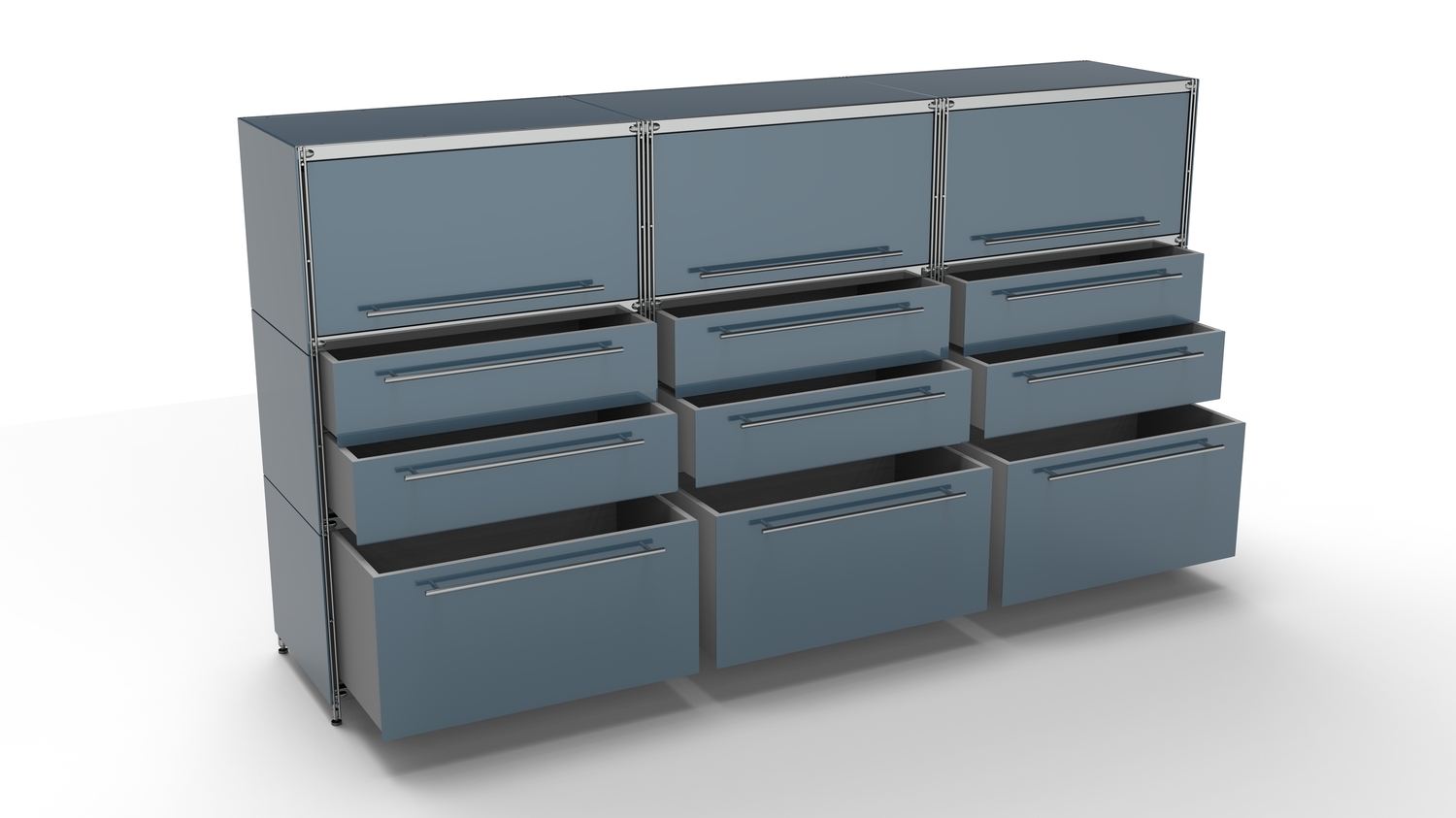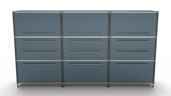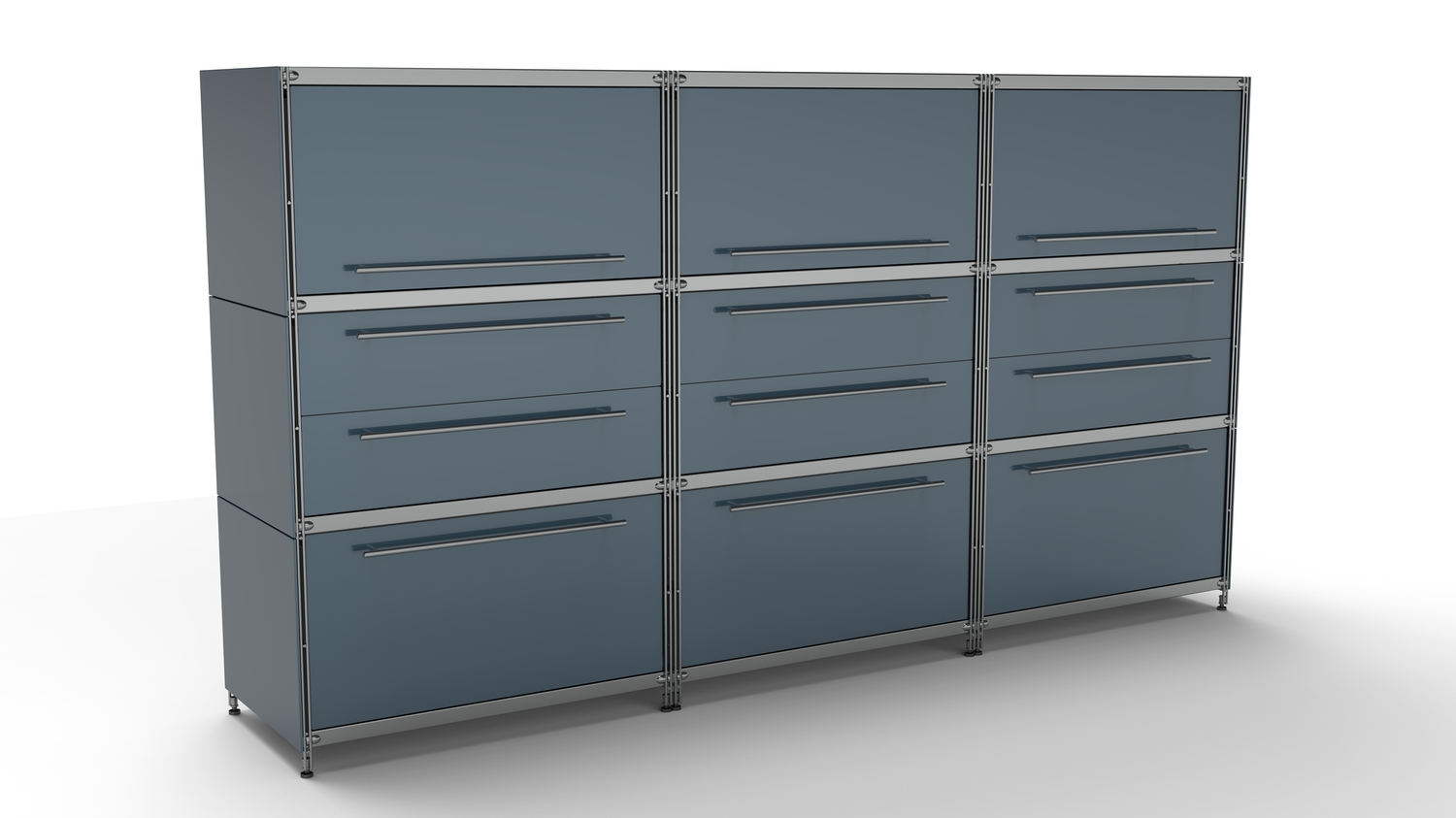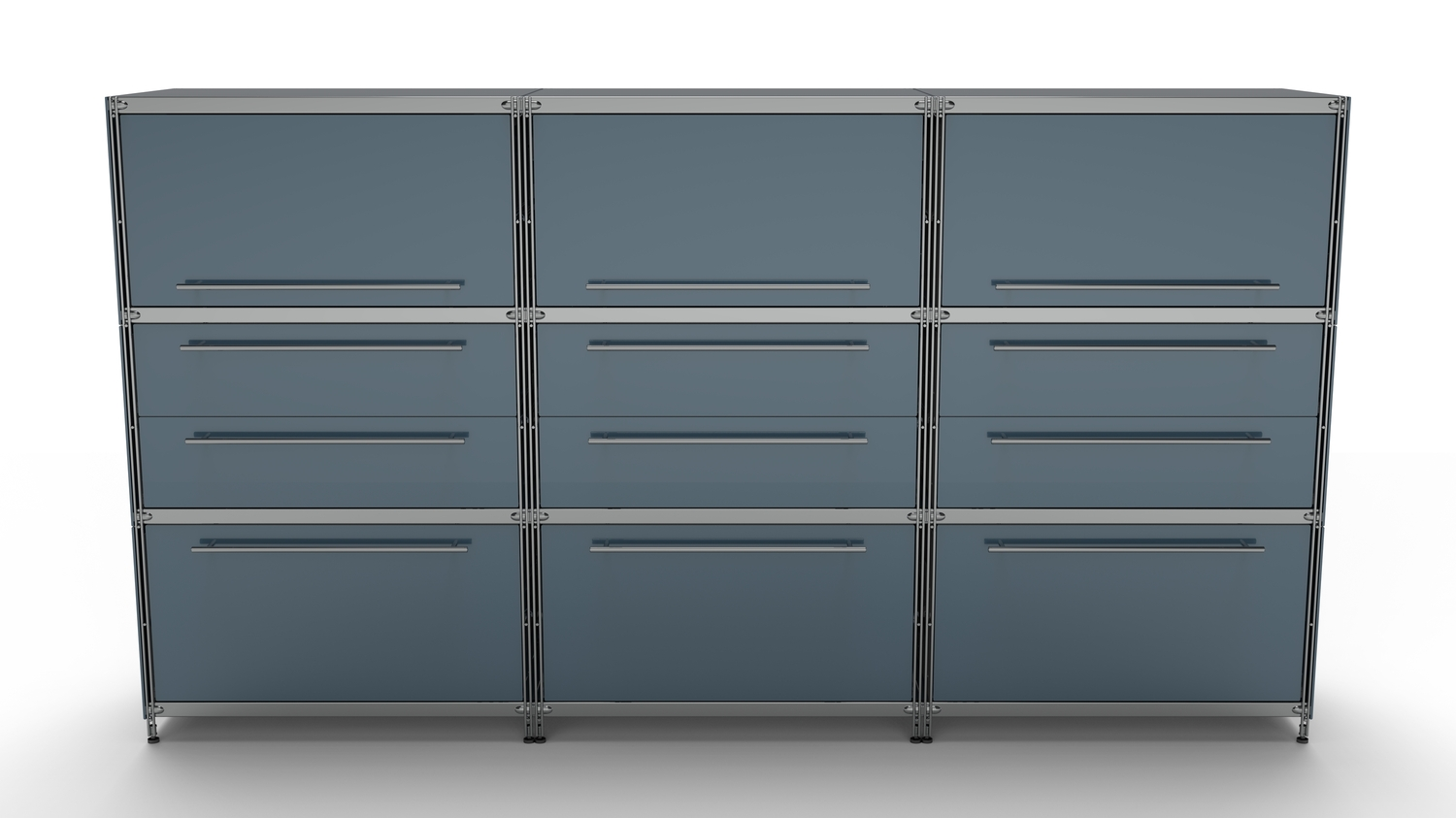 Metall-KUBUS in Höhe und Breite beliebig mit Klappen, Doppelschublade, großem Schubfach oder offenen Elementen lieferbar. In weiteren Farbvarianten erhältlich: weiß, schwarz oder Sonderfarben.