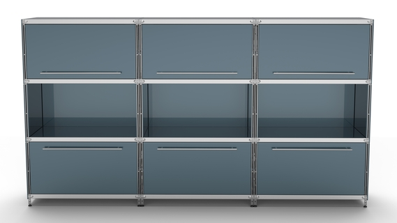 Metall-KUBUS in Höhe und Breite beliebig mit Klappen, Doppelschublade, großem Schubfach oder offenen Elementen lieferbar. In weiteren Farbvarianten erhältlich: weiß, schwarz oder Sonderfarben.