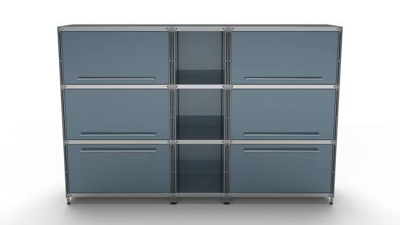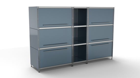 Metall-KUBUS in Höhe und Breite beliebig mit Klappen, Doppelschublade, großem Schubfach oder offenen Elementen lieferbar. In weiteren Farbvarianten erhältlich: weiß, schwarz oder Sonderfarben.