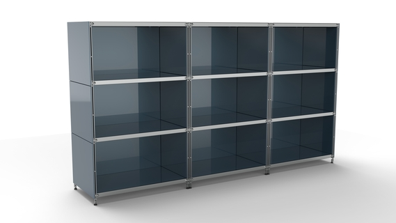 Metall-KUBUS in Höhe und Breite beliebig mit Klappen, Doppelschublade, großem Schubfach oder offenen Elementen lieferbar. In weiteren Farbvarianten erhältlich: weiß, schwarz oder Sonderfarben.
