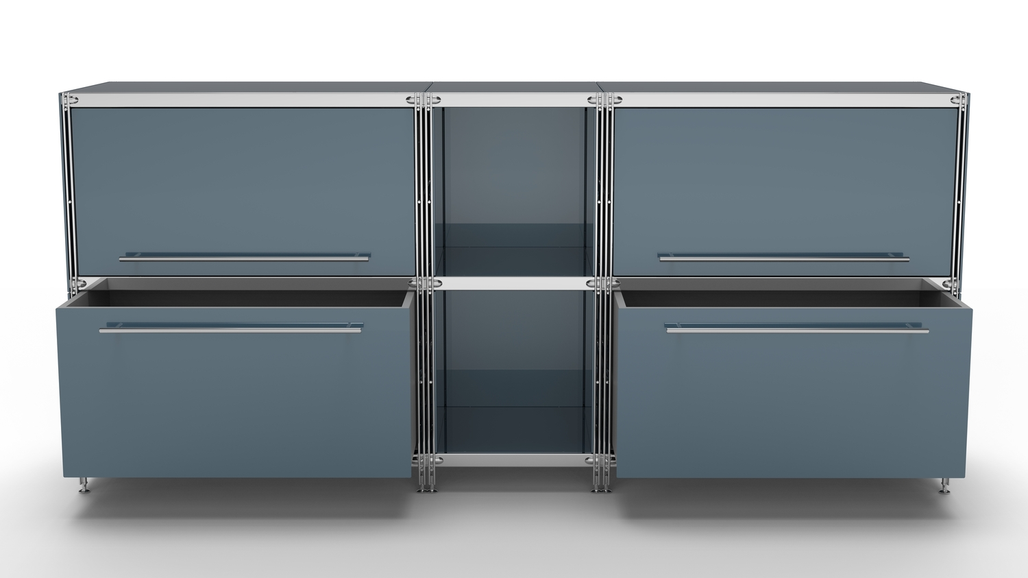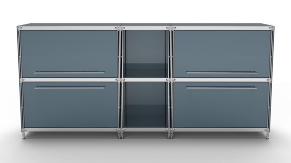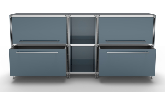 Metall-KUBUS in Höhe und Breite beliebig mit Klappen, Doppelschublade, großem Schubfach oder offenen Elementen lieferbar. In weiteren Farbvarianten erhältlich: weiß, anthrazit oder Sonderfarben.