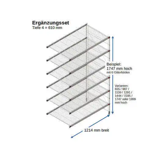 Bestehend aus 2 x Regalleitern, 835 - 987 - 1139 - 1291 - 1444 - 1595 - 1747 - oder 1899 mm hoch, mit 3 - 6 Gitterborden je nach gewählter Ausführung, 1214 mm breit. Erweiterbar!