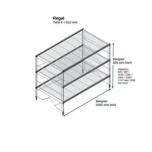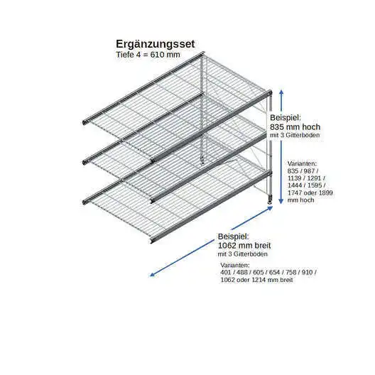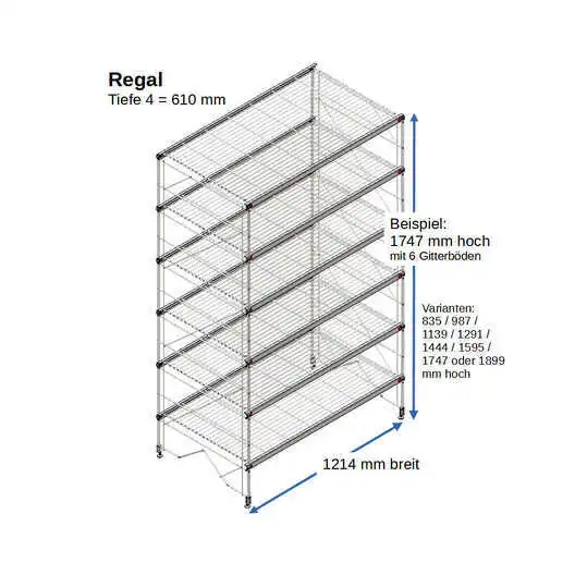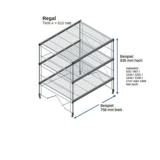 Bestehend aus 2 x Regalleitern, 835 - 987 - 1139 - 1291 - 1444 - 1595 - 1747 - oder 1899 mm hoch, mit 3 - 6 Gitterborden je nach gewählter Ausführung,488 mm breit. Erweiterbar!
