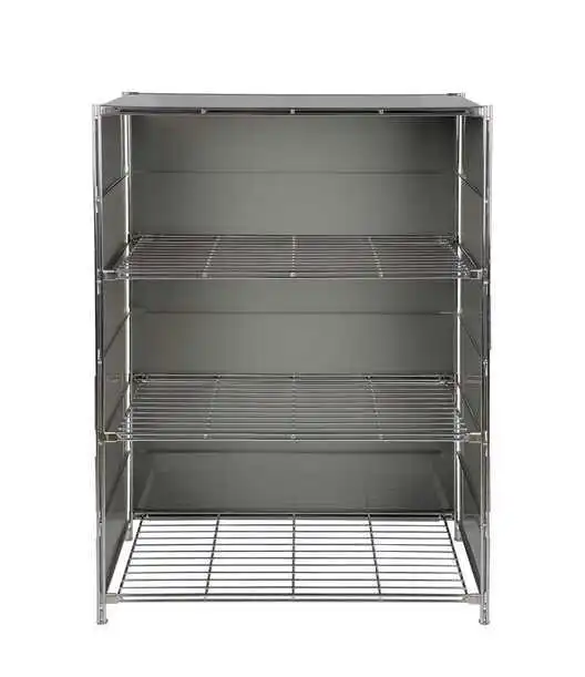 Schlichtes Metallregal mit großzügigem Stauraum. Rückverkleidung und Seiten-Blenden in edlem Weiß. Auf dem obersten Gitterboden liegt eine weiße Glas-Abdeckung aus satiniertem Milchglas auf.