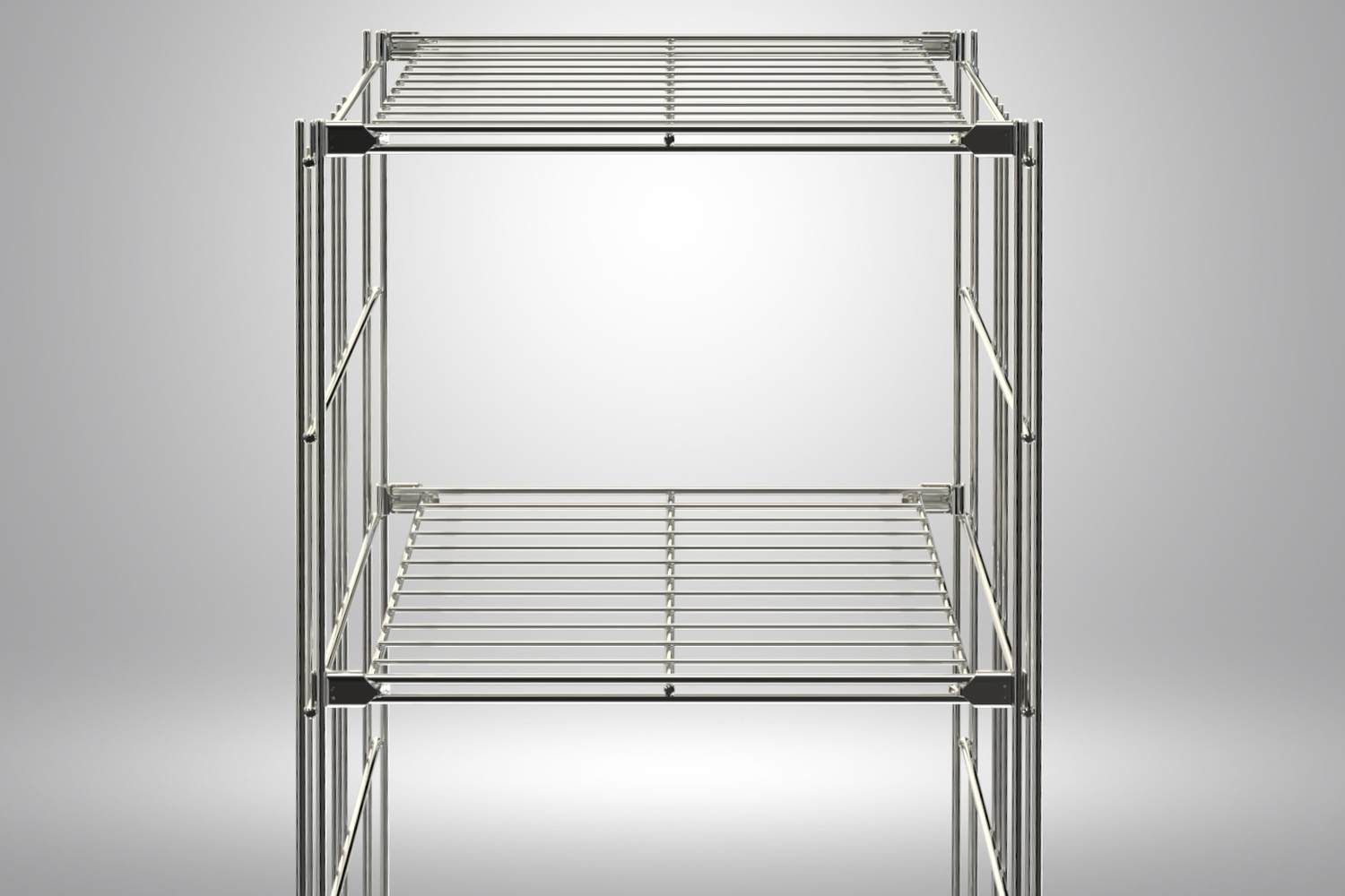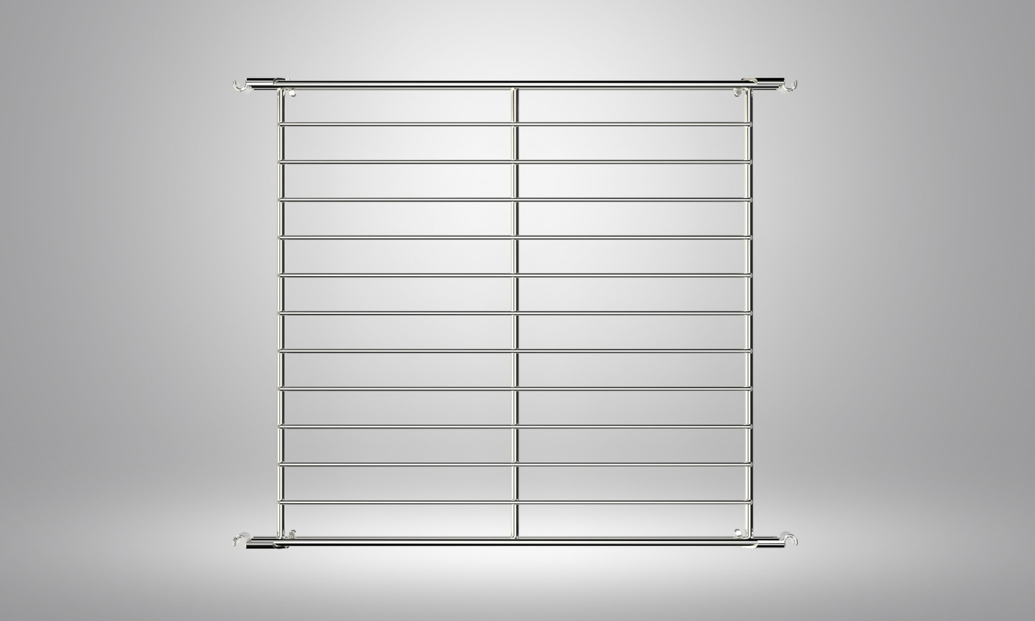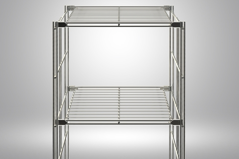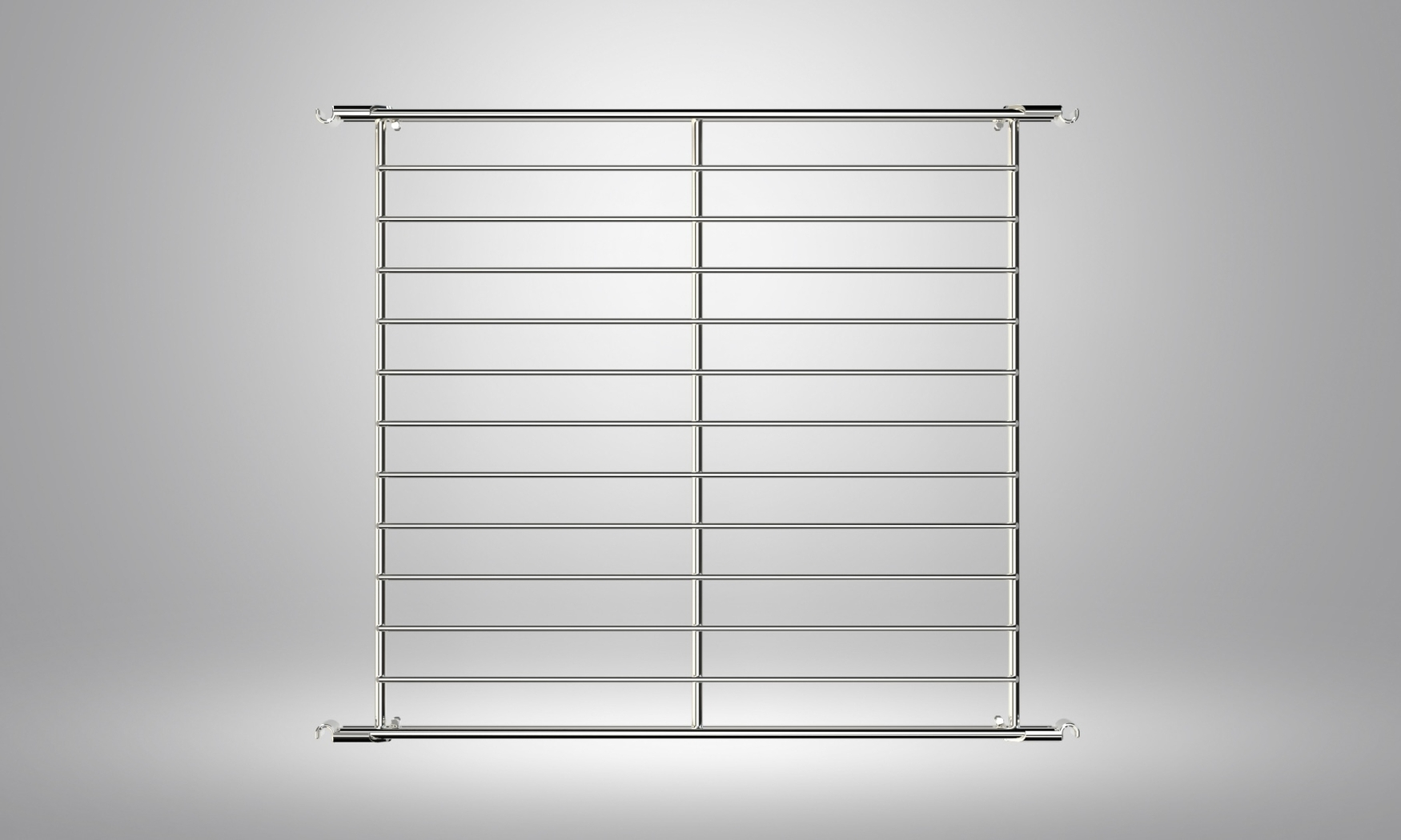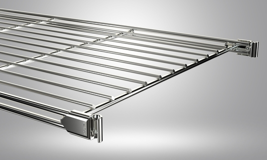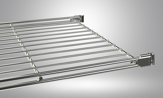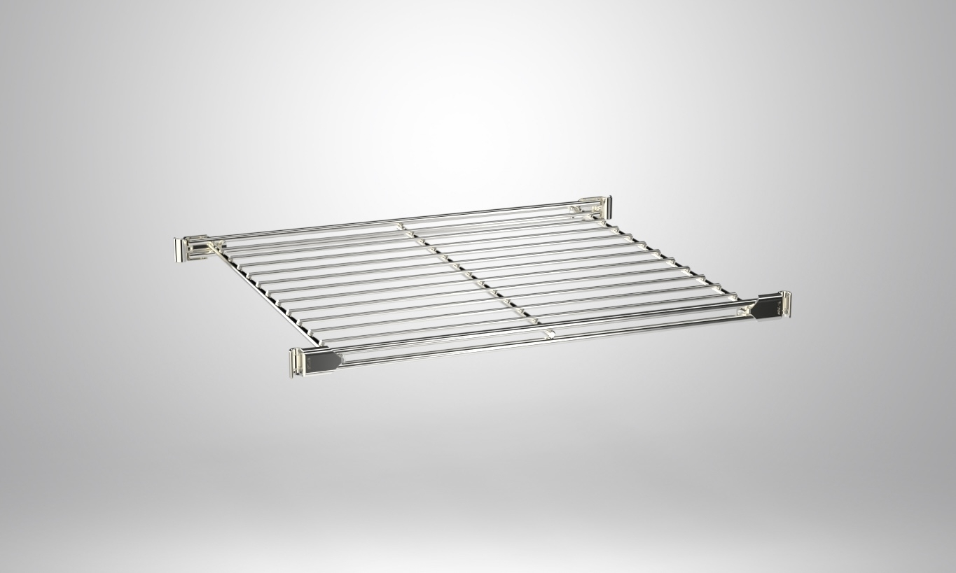 Hochwertig verarbeiteter Gitterboden aus verchromtem Stahl mit 4 Beschlägen zum Befestigen des Regalleiter  Diese liegen dem Boden bei. Die Innenmaße des Gitterbodens ohne Beschläge beträgt 395x370 mm.