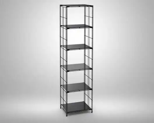 1x Regal mit 5 Gitterböden mit Glasauflagen (Sicherheitsglas), pulverbeschichtet, schwarz, 48 cm, 67 cm, 87 cm oder 106 cm breit, 38 cm tief.