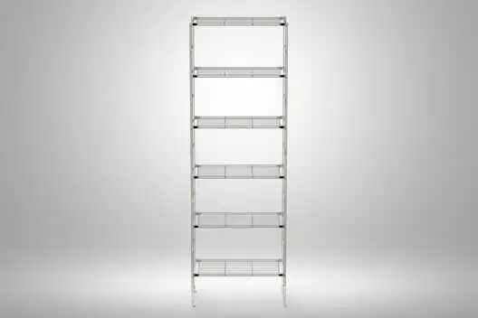 1 Set bestehend aus: 2x Regalleitern (Chrom), 5x Lochblechböden pulverbeschichtet RAL 9016 weiß seidenmatt in 48 cm oder 87 cm Breite, zerlegt mit Montagematerial