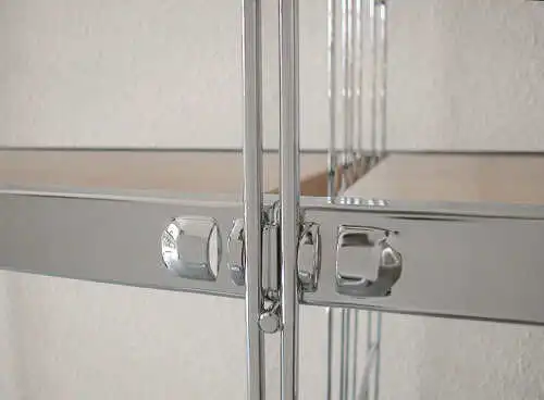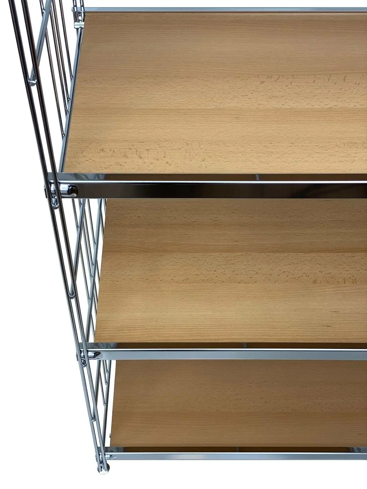 Die Böden lassen sich an jeder Querstrebe einhängen. Mit Ergänzungssets ist das Regal in der Breite beliebig erweiterbar.