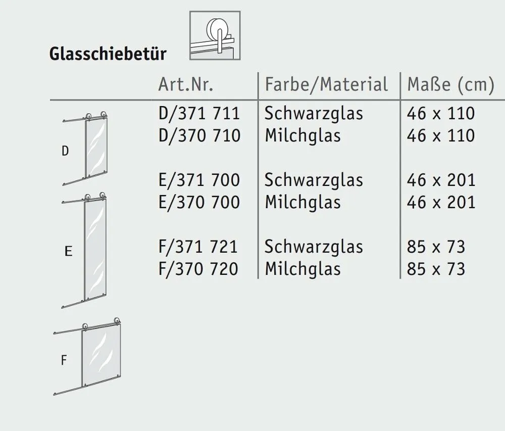 - Ausführung: Schwarzglas oder satiniertes Milchglas, Sicherheitsglas, 4 mm stark