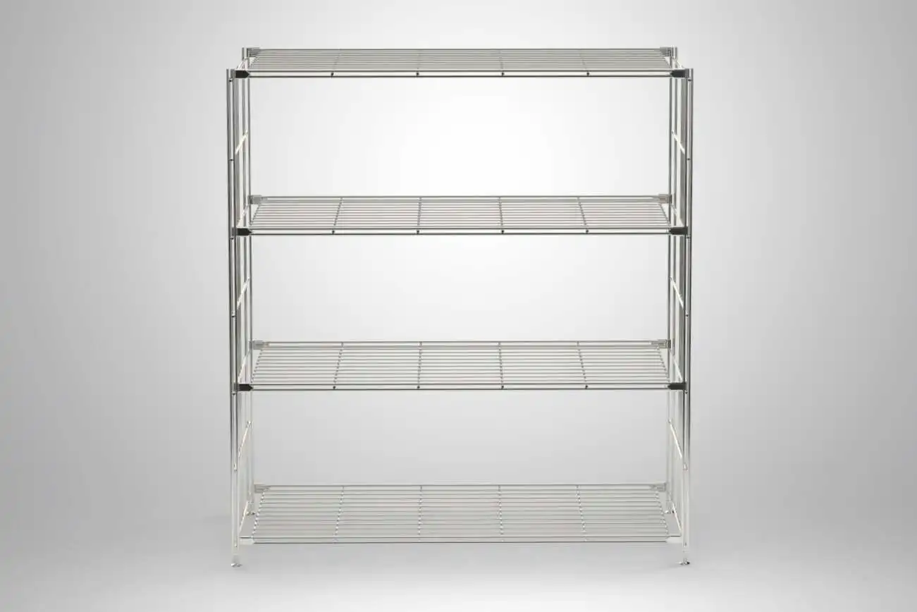 Regalset mit 4 Gitterböden, 117 cm hoch, 106 cm breit, 38 cm tief, Metall verchromt
