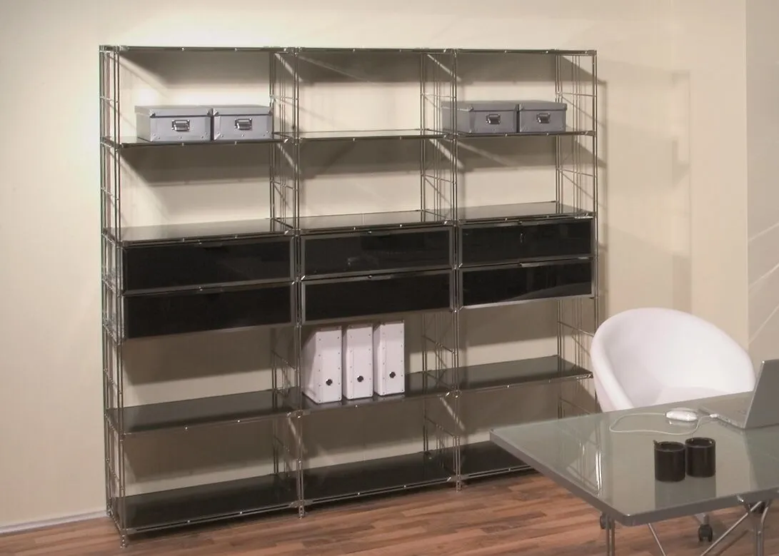 Die Metallschublade mit Chrom-Blende und schicker Schubladenfront mit Schwarzglas-Füllung schafft Ordnung in Ihr Regal. Die hochwertige Glasfront ist aus 4mm Sicherheitsglas. Die Schublade ist 46 cm breit und 37 cm hoch. Die Schubladen lassen sich in Regale der Produktlinie BIII mit 380 cm Tiefe einhängen!