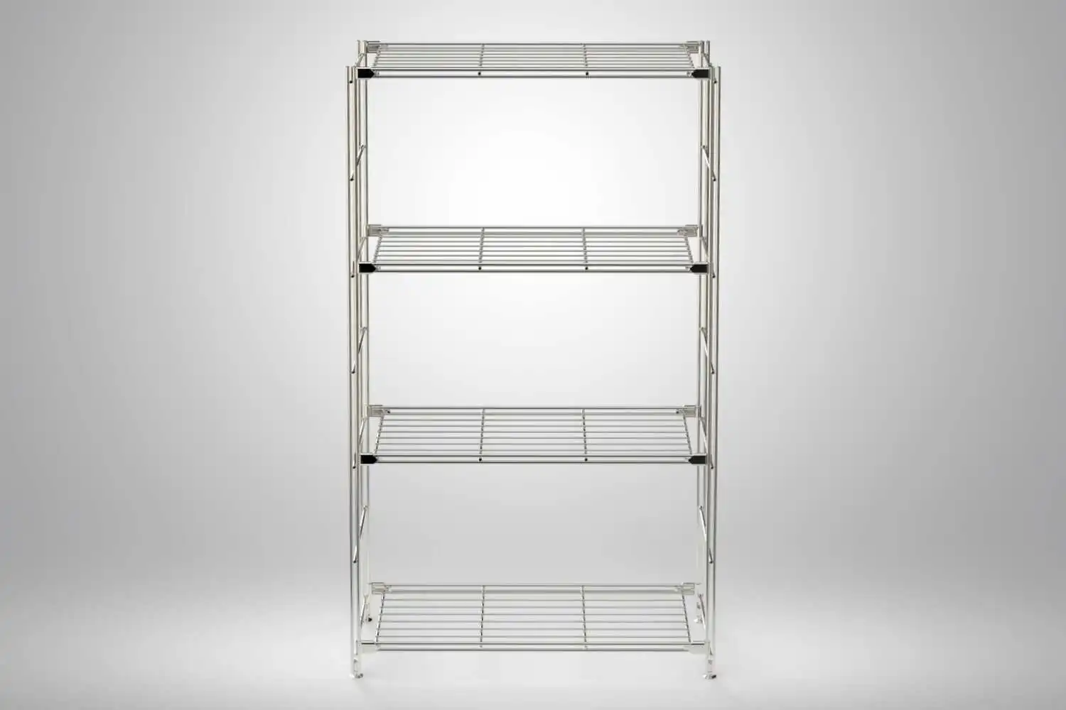 Hochwertig verarbeitete Regalleiter aus verchromtem Stahl. Durch den höhenverstellbaren Fuß lassen sich Bodenunebenheiten leicht ausgleichen.