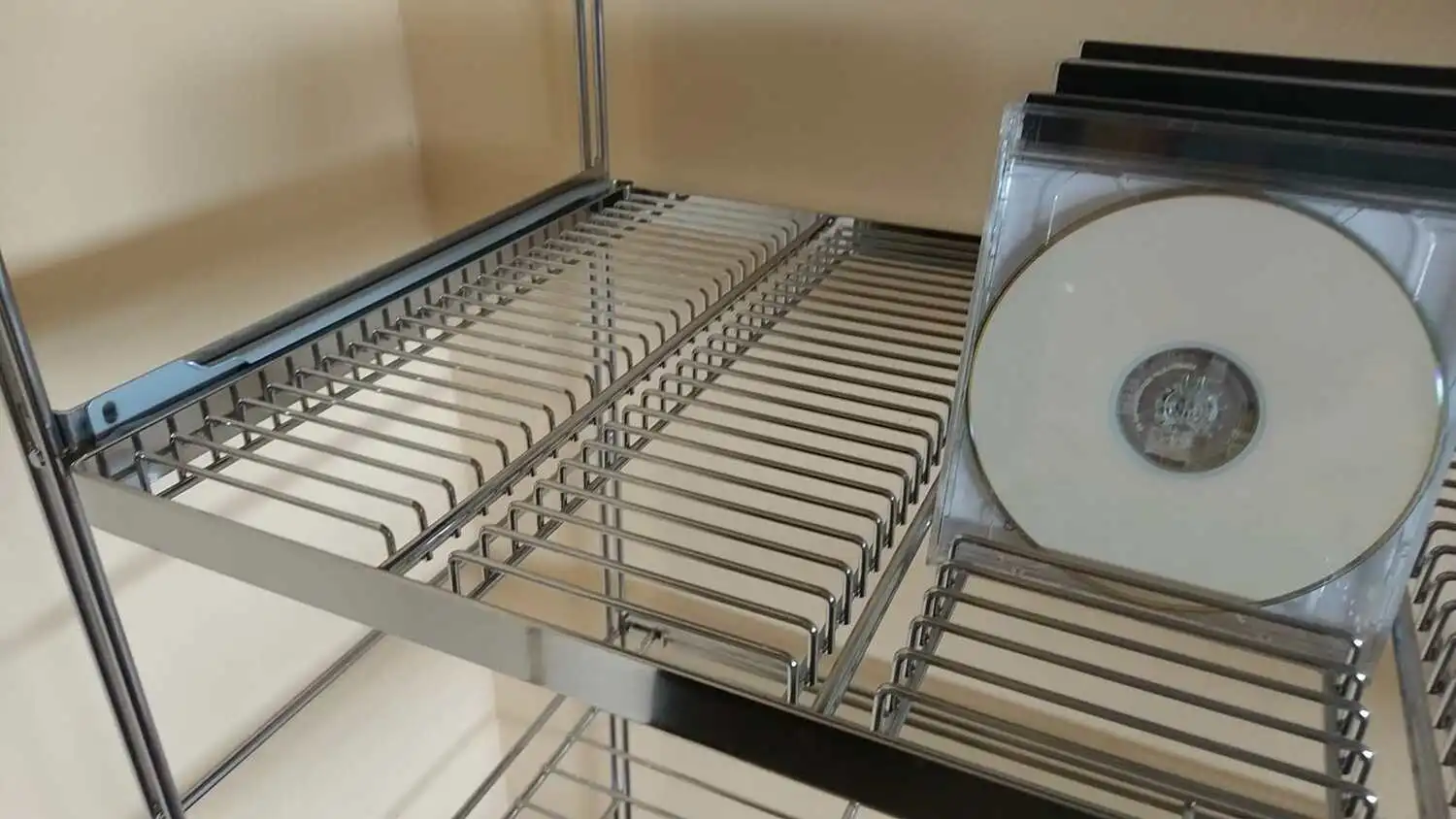 Hochwertig verarbeiteter DVD-Boden, aus Metall, verchromt, ausziehbar für 80 DVDs.