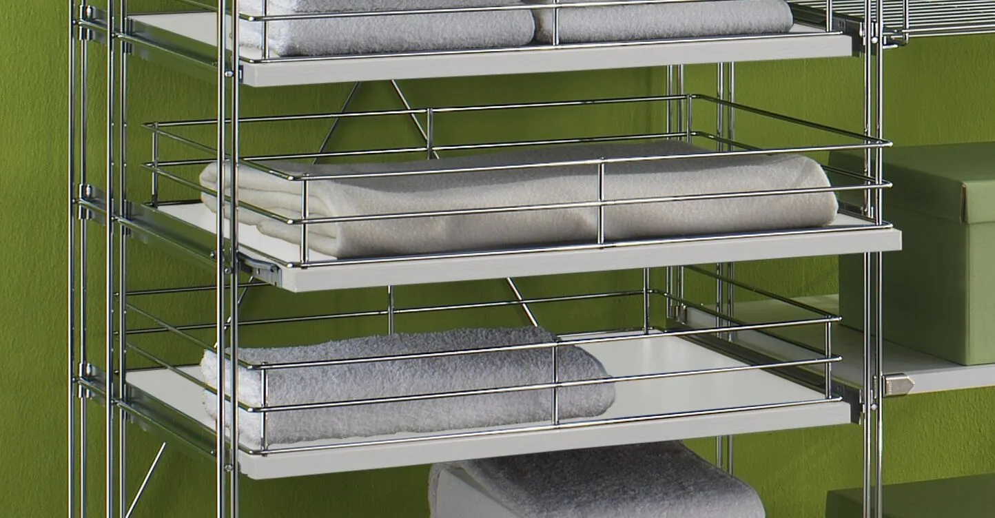 Der Holzboden mit Metallrahmen (Chrom) lässt sich herausziehen. Textilien werden so übersichtlich und handlich präsentiert. Wahlweise in 46 cm, 65 cm oder 85 cm Breite. Lieferbar in Kirsche furniert, Wenge (foliert) oder weiß lackiert. Geeignet zum nachträglichen Einbau in bereits aufgebaute Regale!