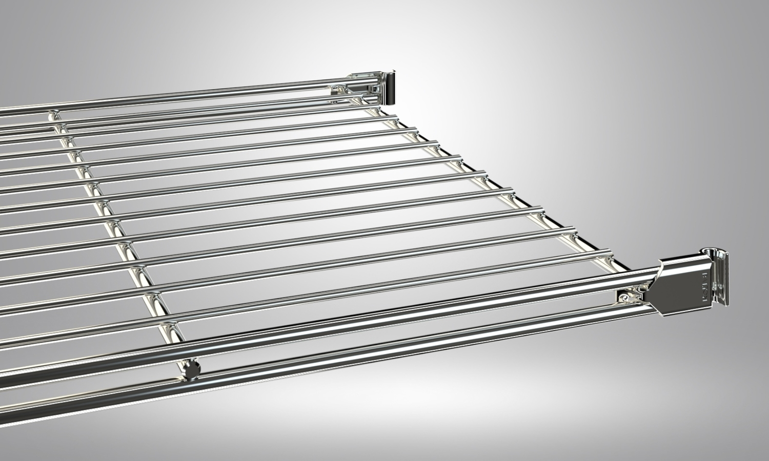 Hochwertig verarbeiteter Gitterboden aus verchromtem Stahl mit 4 Beschlägen zum Befestigen des Regalleiter Diese liegen dem Boden bei. Die Innenmaße des Gitterbodens ohne Beschläge beträgt 395x370 mm.