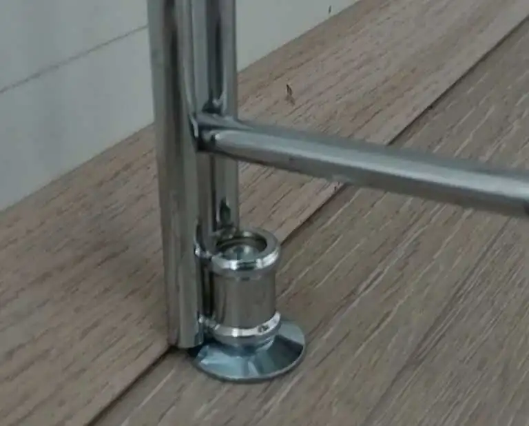 Hochwertig verarbeitete Regalleiter aus verchromtem Stahl. Durch den höhenverstellbaren Fuß lassen sich Bodenunebenheiten leicht ausgleichen.