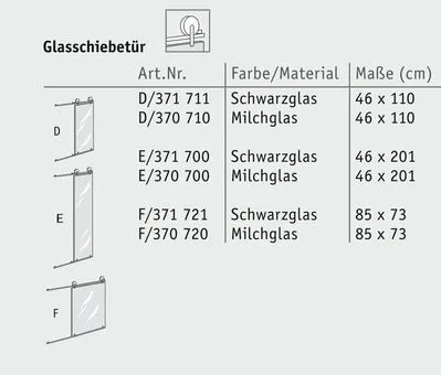 Chice Schiebetür in satinierter Milchglasfront oder Schwarzglas. Die Türen können an Gitter- Blech- und Holzböden in 46 cm Breite befestigt werden. Befestigungsmaterial zur Montage an Gitterböden liegt bei. Bei Befestigung an Holzböden oder Blechböden bitte die benötigten Halterungen separat bestellen!
