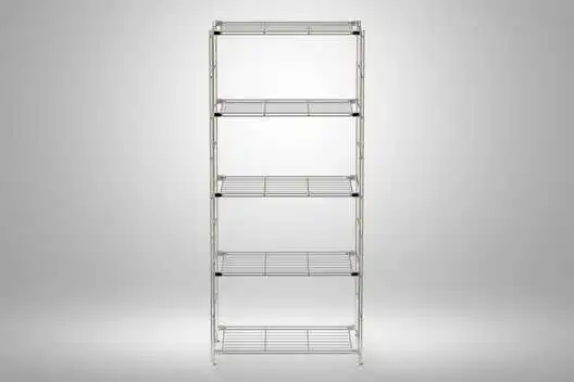 Hochwertig verarbeitete Regalleiter aus verchromtem Stahl. Durch den höhenverstellbaren Fuß lassen sich Bodenunebenheiten leicht ausgleichen.