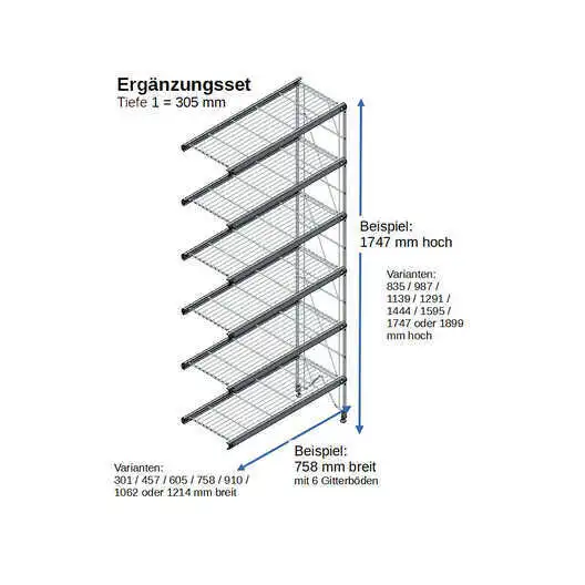 Bestehend aus 2 x Regalleitern, 835 - 987 - 1139 - 1291 - 1444 - 1595 - 1747 - oder 1899 mm hoch, mit 3 - 6 Gitterborden je nach gewählter Ausführung, 1062 mm breit. Erweiterbar!
