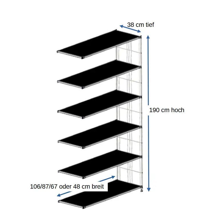 Für freistehenden Regale empfehlen wir zusätzlich Kreuzstreben zur Stabilisierung anzubringen.