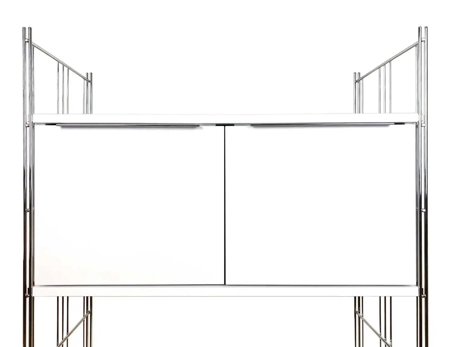 1x Highboard bestehend aus verchromten Regalseitenteilen, Türenkorpus + 2 Böden in weiß, 117x87x38 cm (Höhe x Breite x Tiefe), zerlegt, erweiterbar