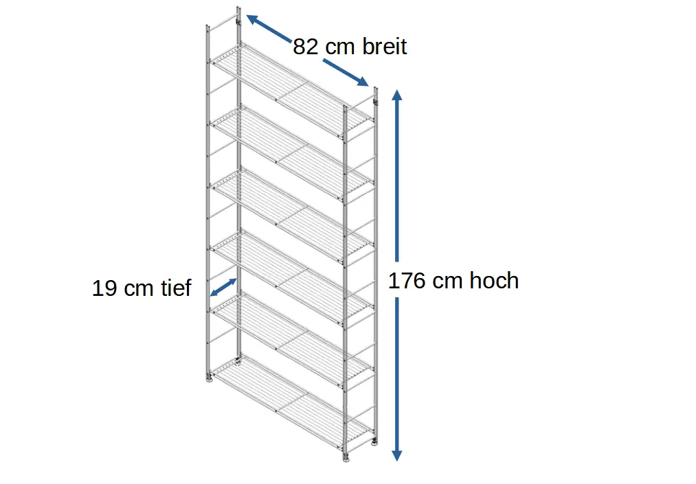 - 6 x Ablageböden: Gitterböden 19 cm tief, mit Befestigungs-Beschlägen in der jeweiligen Ausführung, Metall, verchromt