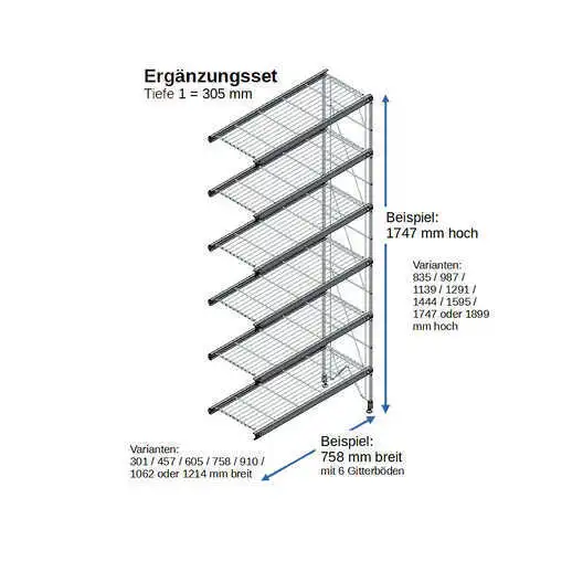 Bestehend aus 2 x Regalleitern, 835 - 987 - 1139 - 1291 - 1444 - 1595 - 1747 - oder 1899 mm hoch, mit 3 - 6 Gitterborden je nach gewählter Ausführung, 758 mm breit. Erweiterbar!