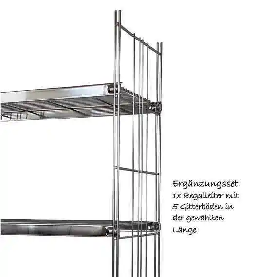 1x Regalset mit 5 Gitterböden in der gewählten Ausführung: 61 cm, 76 cm oder 91 cm breit, Metall verchromt + Wandbefestigungen - so lange Vorrat reicht