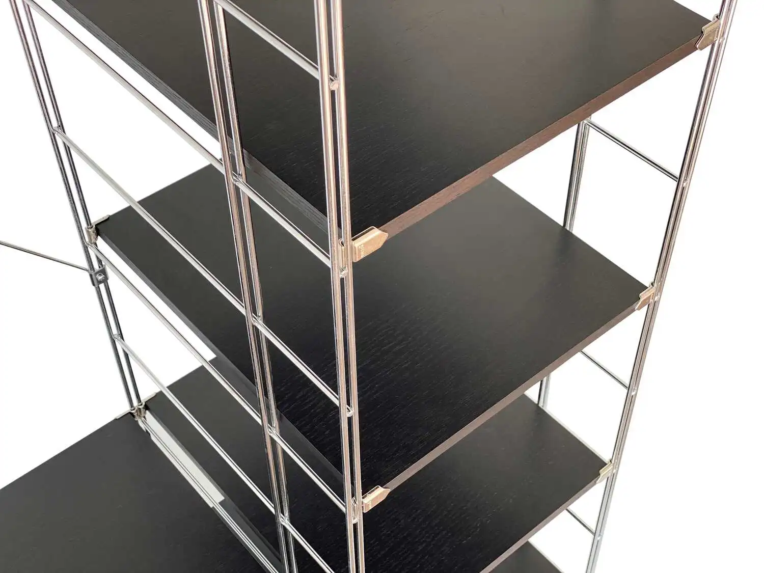 Der dunkle Holzboden wirkt besoders edel! Kombiniert mit dem Chrom zeigt das hochwertige Regal-System besonderen Scharm!